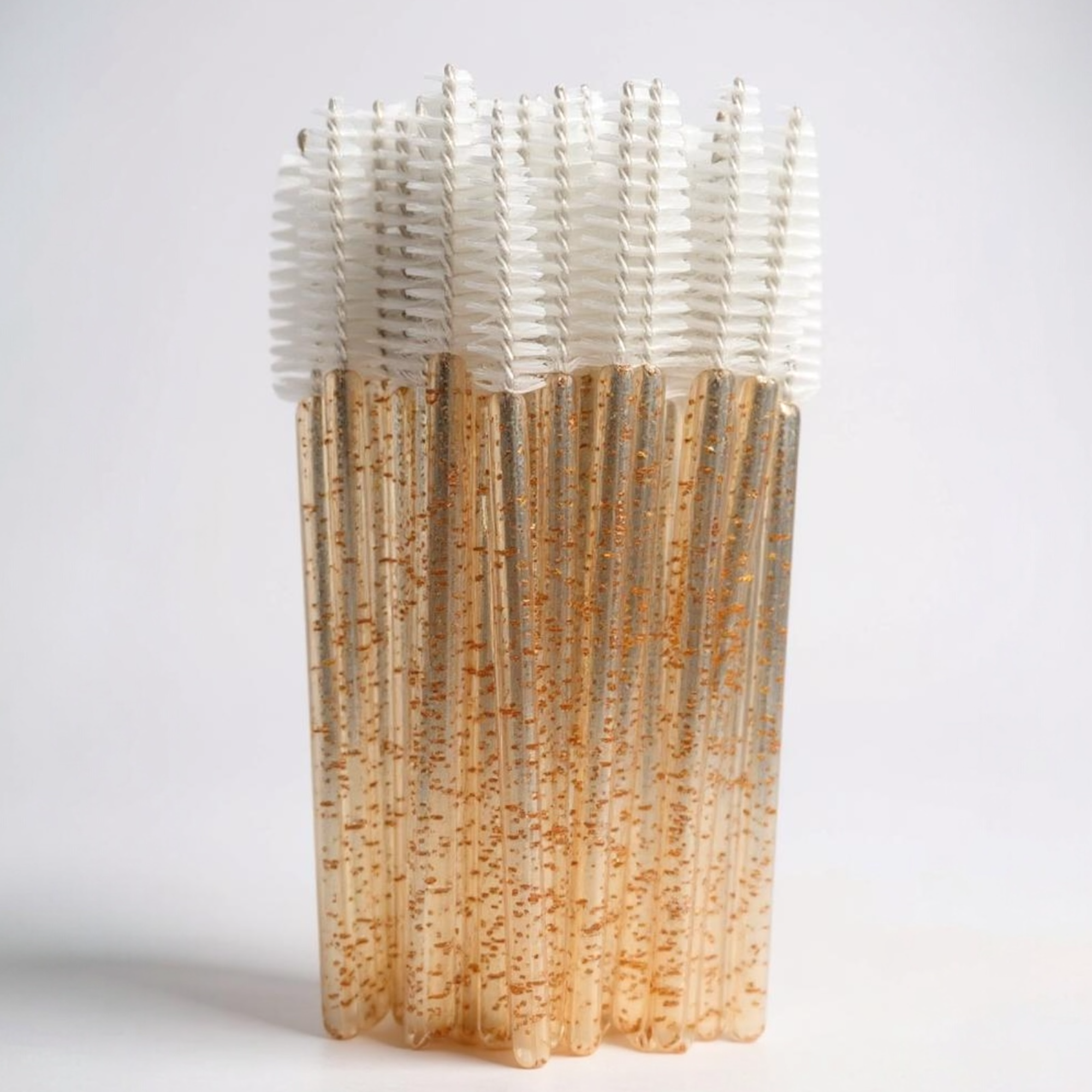 Rose Gold Glitter eyelash brushes for brushing eyelash extensions.